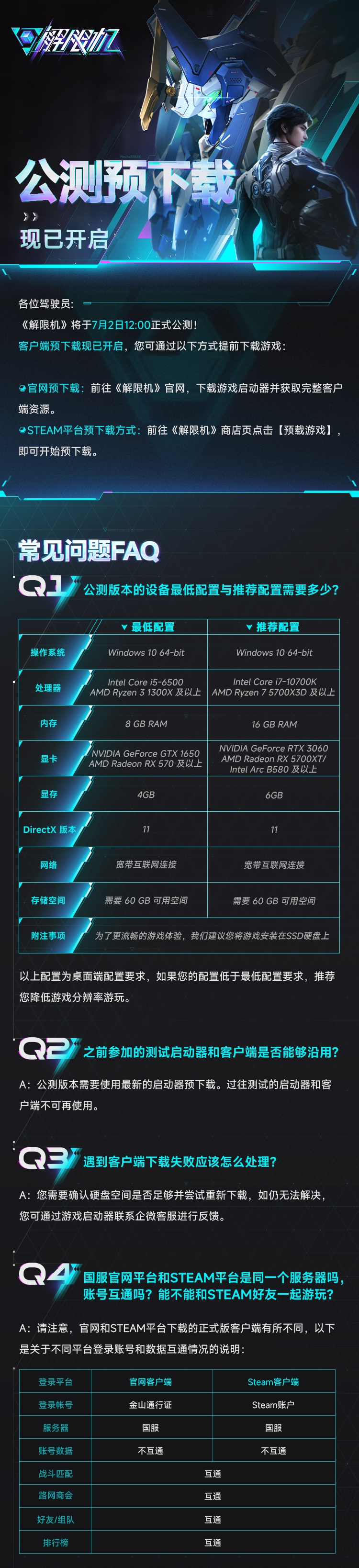 配置需求方面,《解限机》最低要求英特尔酷睿 i5-6500 / AMD R3 1300X 及以上处理器、 GTX 1650 / RX 570 及以上显卡、8GB 内存,推荐使用 i7-10700K / R7 5700X3D 及以上处理器、RTX 3060 / RX 5700XT 及以上显卡、16GB 内存。