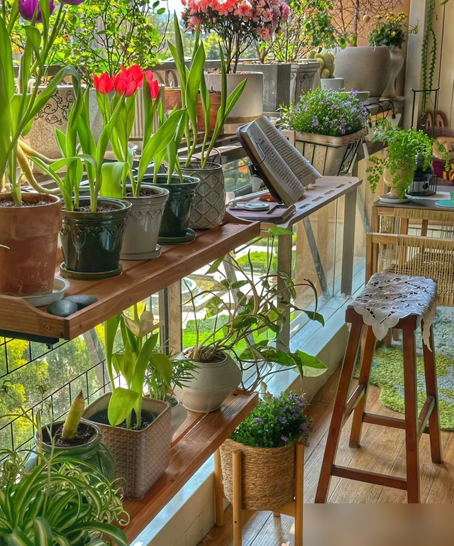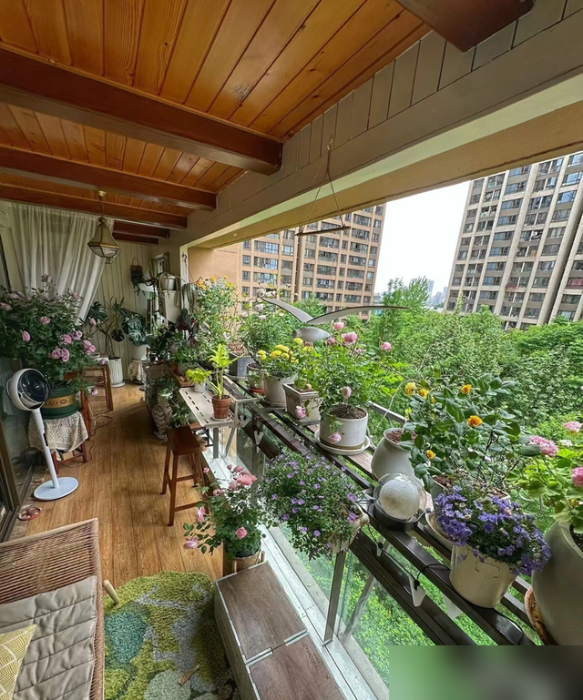 现在年轻人总焦虑没大房子没露台,可看看这十平米:绿植按高矮错落上架,藤蔓顺着支架爬,花开时层层叠叠像立体画——螺蛳壳里做道场,靠的是肯花心思的巧手。