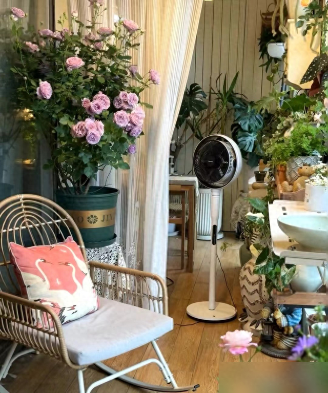 最绝的是阿姨敢用吊椅——这玩意儿在别人家早成晾衣架了,她愣是搭配风扇造出个夏日安乐窝。